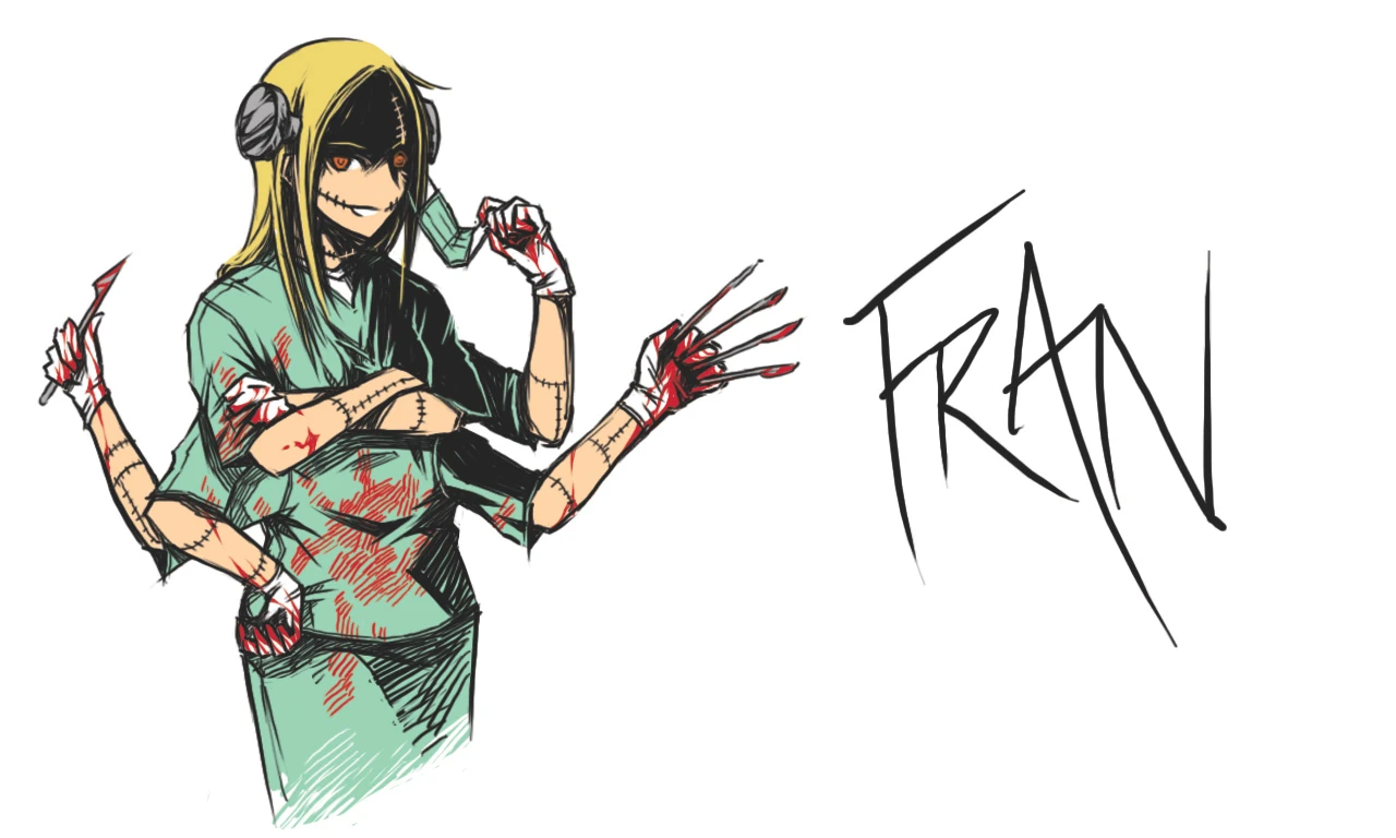 Фран выглядит как хорошенькая белокурая девочка лет пятнадцати (на самом деле, она старше). В ее голову встроены болты, лицо и тело покрыты шрамами, глаза иногда выпадают, после чего она вставляет их обратно в глазницы. Во время операций она приделывает себе одну или несколько дополнительных пар рук — количество зависит от сложности операции. Иногда она даже отделяет свою голову, управляя телом на расстоянии. Одета она, как правило, в белый халат, во время операций цепляет дополнительное оборудование, а в школе носит школьную форму самых разных видов.