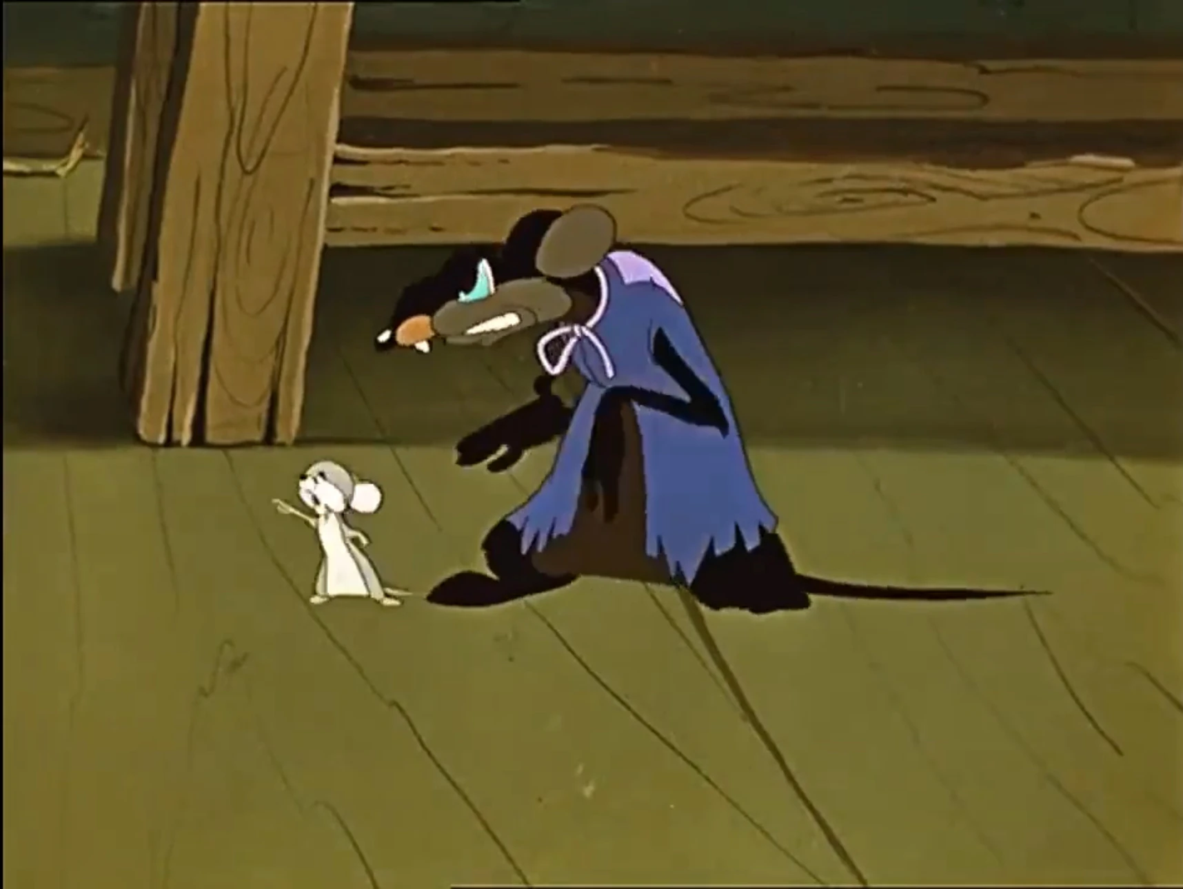 Потом папа Карло уходит покупать своему сыну азбуку, и Буратино остаётся дома голодным. В припадке голода он замечает яйцо, которое тащили крысята, и запускает в них молотком. Потом Буратино протыкает яйцо своим длинным носом с целью поесть, но замечает цыплёнка, который благодарит деревянного мальчика за спасение и вылетает в открытое окно. Один из крысят видел это и позвал крысу Шушару разобраться с мелким вором. Злодейке почти удаётся это сделать, но в последний момент домой приходит папа Карло и бросает в крысу метлу, отчего та сбегает.
